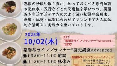 教室・講座 【募集】09/11(木)薬膳茶ライフプランナー®Advanced 1Day認定レッスン 9/11(木)に薬膳茶ライフプランナー®認定講座「Advanced」の1Day認定レッスンを開催いたします。この講座は薬膳茶ライフプランナー®認定講座「Advanced」の「前編」・「後編」・「認定」を1日でご受講いただき「薬膳茶ライフプラ... 2025.09.06 教室・講座