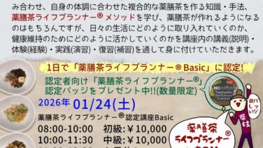 01/24(土)に薬膳茶ライフプランナー®認定講座「Basic」の1Day認定レッスンを開催いたします。この講座は薬膳茶ライフプランナー®認定講座「Basic」の「初級」・「中級」・「上級」・「認定」を1日でご受講いただき「薬膳茶ライフプラ...