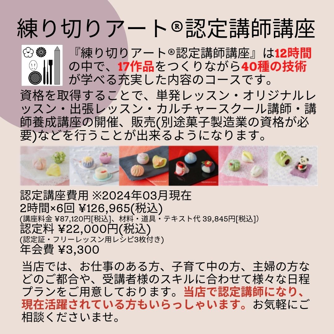 武谷清風堂にて「練り切りアート®認定講座」をご受講いただけます。練り切りアート®(nerikiri art®)認定講師講座は、12時間の中で17作品をつくりながら40種の技術が学べる充実した内容の資格取得コースです。資格取得後のフォローアッ...