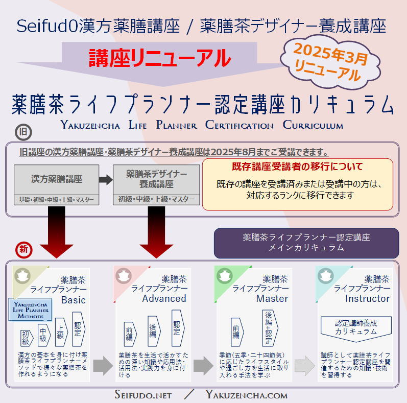 ★ランク移行は任意です旧講座 → 「薬膳茶ライフプランナー®認定講座」の対応ランクへの移行が出来ます★「薬膳茶ライフプランナー®」は登録商標です。・Seifudo漢方薬膳講座・薬膳茶デザイナー養成講座をご受講済みの方は、「薬膳茶ライフプラン...