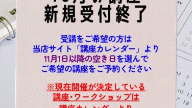 当店で開催しております各種講座、ワークショップですが、10月も引き続き大変多くの講座のご予約をいただいております。日程的にこれ以上の講座やワークショップを開催することが困難な状況となっておりますので、大変申し訳ございませんが、10月の講座・...