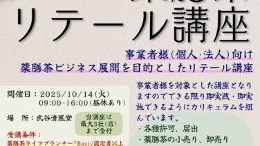「薬膳茶リテール講座」開催のご案内です。10/14(火) 09:00~ 薬膳茶リテール講座 を開催いたします。当講座は「薬膳茶ライフプランナー®認定講座Basic認定者(旧 漢方薬膳講座 マスター認定者)」以上の方で「起業済みの方、既事業を...